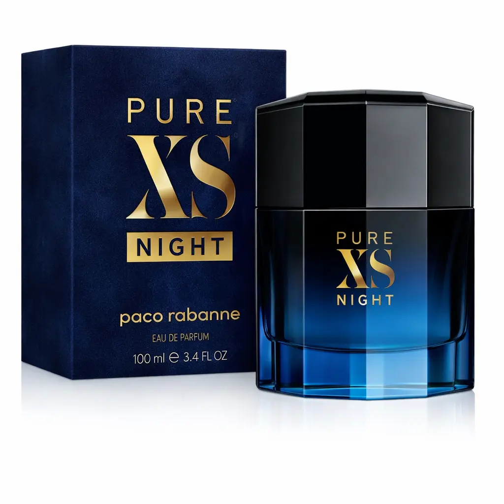El frasco de Pure XS destaca por su diseño moderno y elegante, con líneas minimalistas y detalles dorados que reflejan el lujo característico de la marca.
